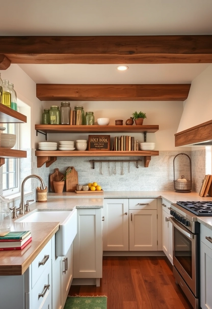Warm lighting enhances the cozy atmosphere, making this kitchen feel inviting and homely. Decorative items like mason jars and vintage cookbooks contribute to the character of the space.