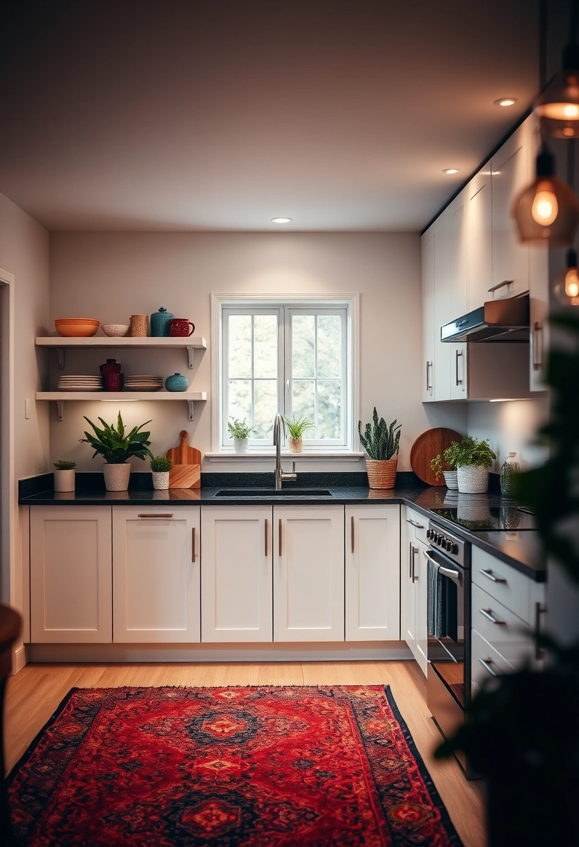 The ambient lighting enhances the smooth textures of the cabinetry, casting a warm glow that invites culinary creativity. A vibrant rug adds a cheerful pop of color, grounding the neutral palette and creating a cozy atmosphere.