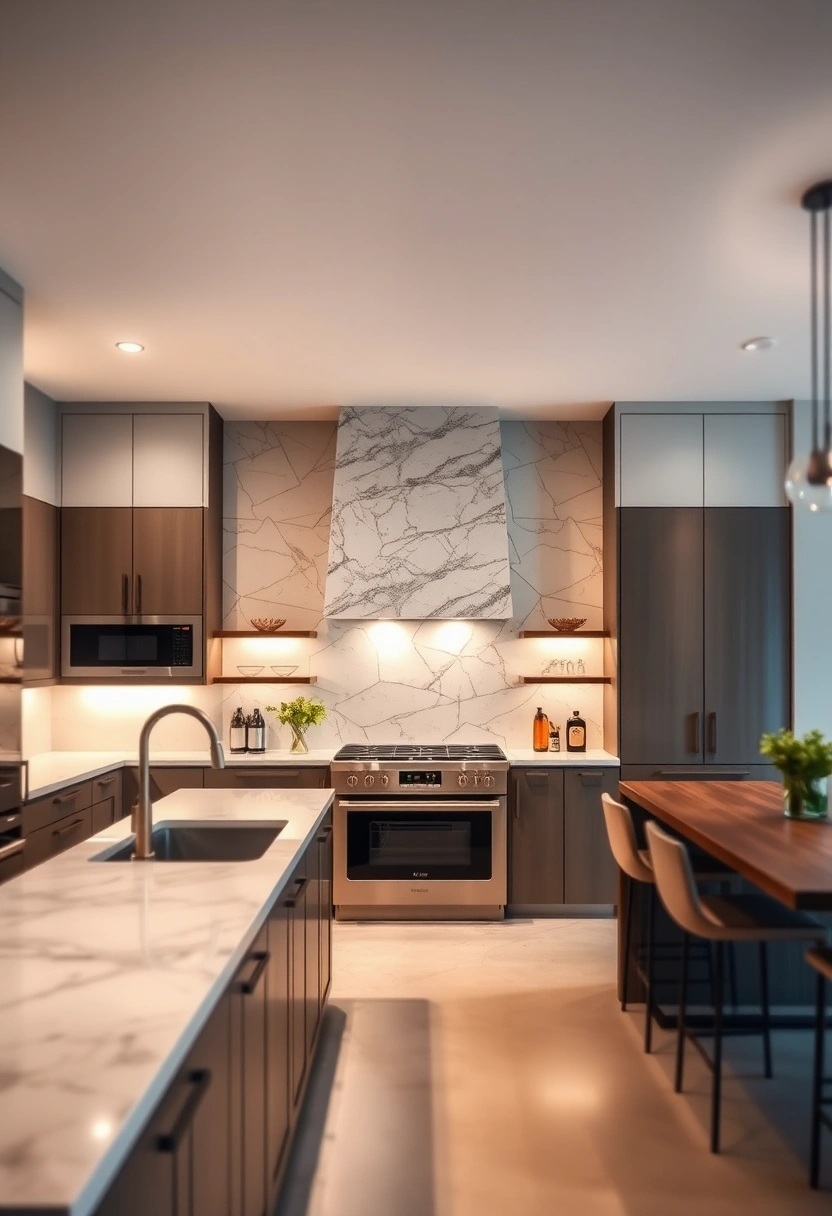The overall design creates an inviting atmosphere perfect for entertaining, embodying a stylish yet comfortable environment. This kitchen is ideal for those who appreciate the finer things in life and seek a space that reflects their personal style while being practical.