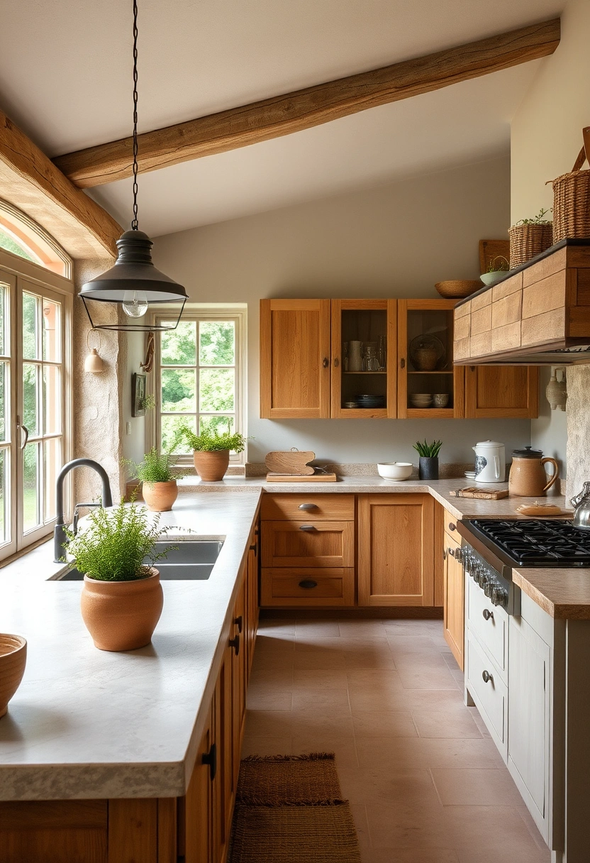 Additional elements like fresh herbs in pots and woven baskets contribute warmth and texture, making this kitchen a true retreat for culinary enthusiasts. The combination of natural materials and thoughtful design creates a harmonious space that invites relaxation and creativity.