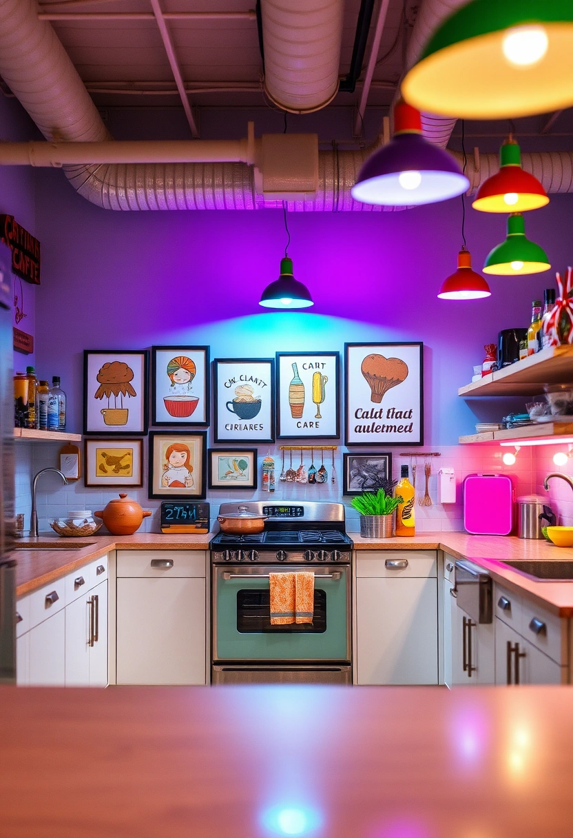 A gallery wall adorned with culinary-inspired art adds a touch of creativity, while vibrant, colorful lighting fixtures hang overhead, casting a playful glow. The space feels bright and cheerful, inviting experimentation and culinary exploration.