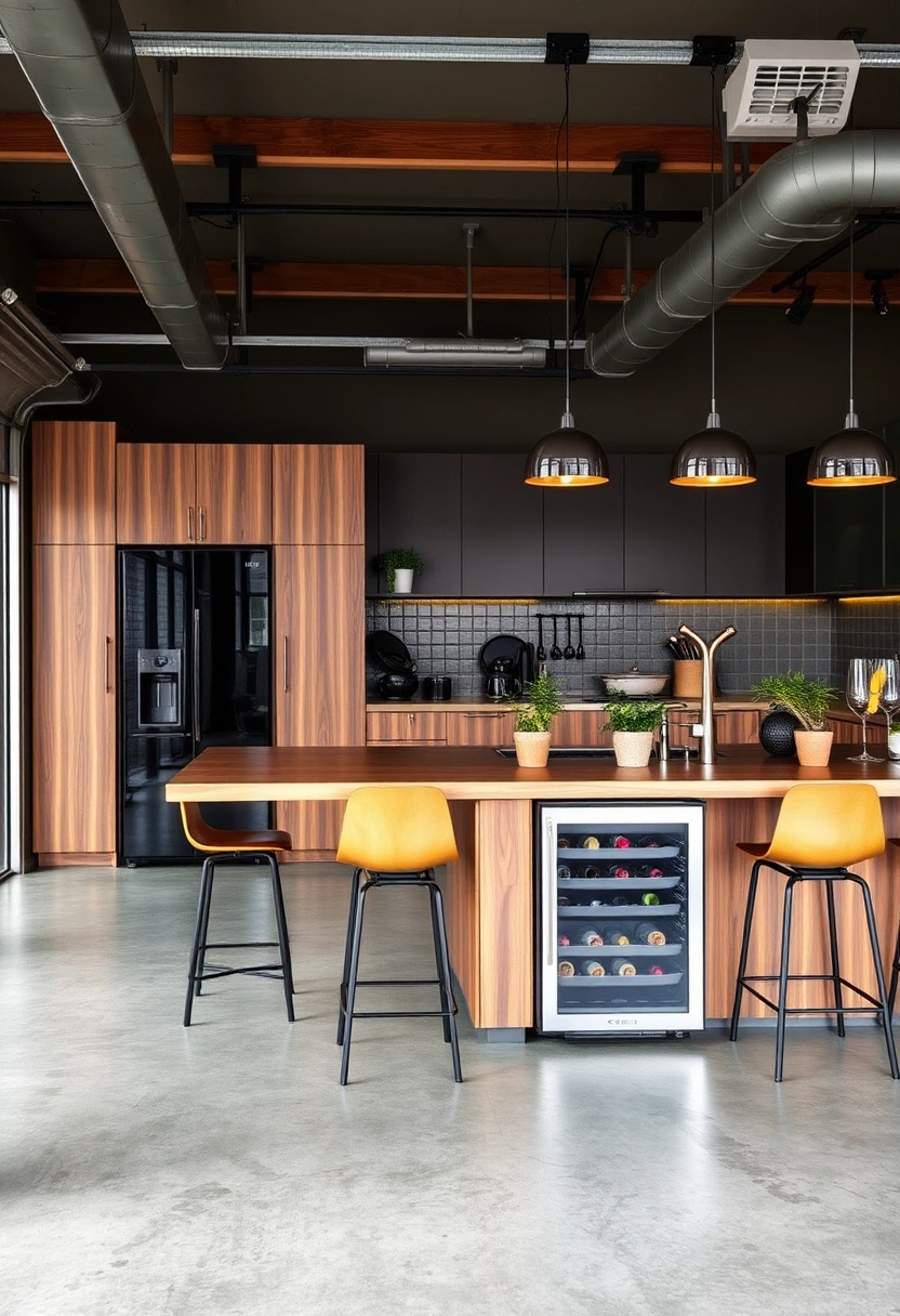 Discover the chic elegance of an urban garage kitchen designed with sleek concrete floors and a sophisticated mix of wood and metal finishes. The layout features a stylish island complete with a built-in wine cooler, flanked by modern bar stools that provide both comfort and aesthetic appeal.