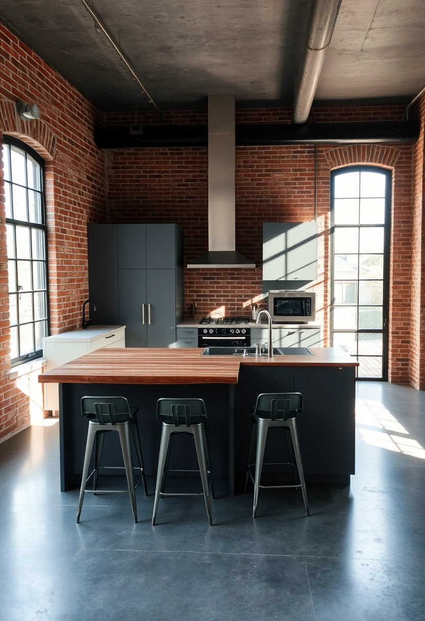 Step into an industrial gray kitchen characterized by exposed brick walls and polished concrete floors, creating a raw yet stylish atmosphere. The layout features a large island with a raw wood top that contrasts beautifully against the sleek gray cabinetry.