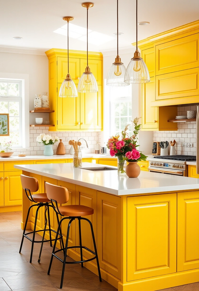 Imagine a bright island kitchen concept featuring a large island with vibrant yellow cabinetry and a white quartz top. Playful bar stools and a cheerful backsplash add character, while natural light floods the space, creating an energetic atmosphere.