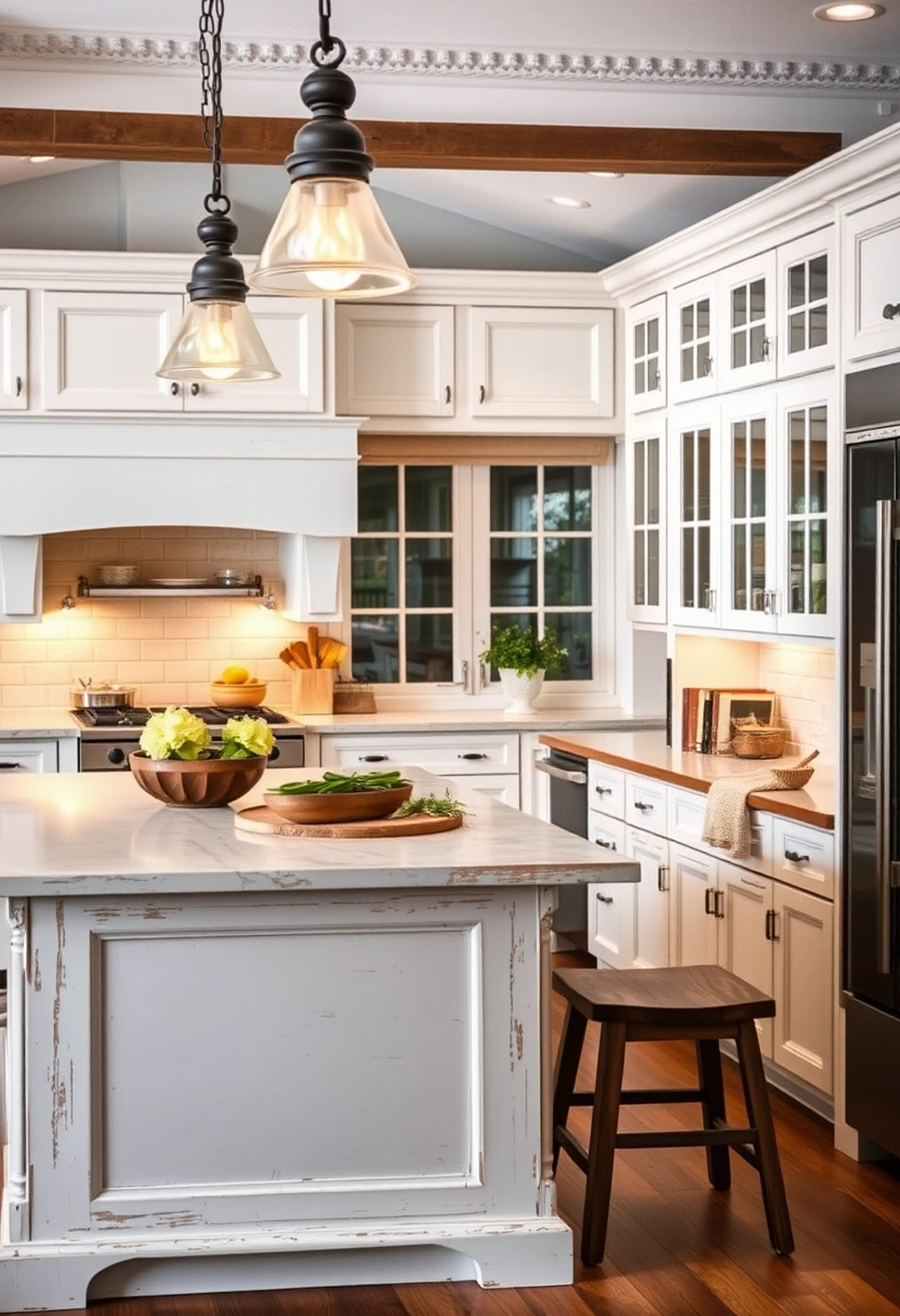 Imagine a charming island kitchen space featuring a large island with a distressed finish and classic white cabinetry. Rustic lighting fixtures hang overhead, creating an inviting atmosphere that beckons you to relax and enjoy.