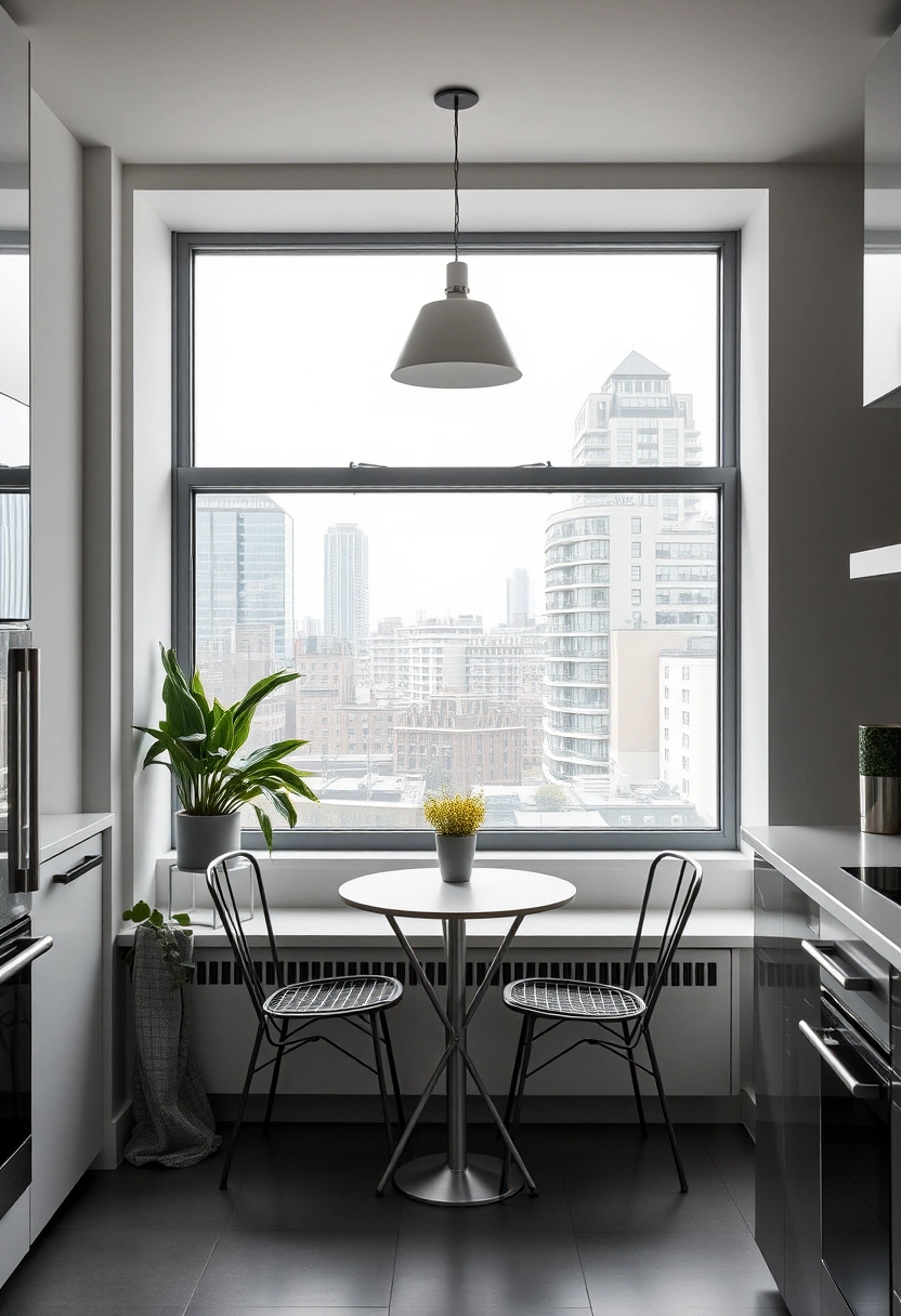 Step into a sleek urban kitchen bay window that features minimalist decor with a large, unadorned window. A small café table and chairs sit close to the window, focusing on the cityscape outside.