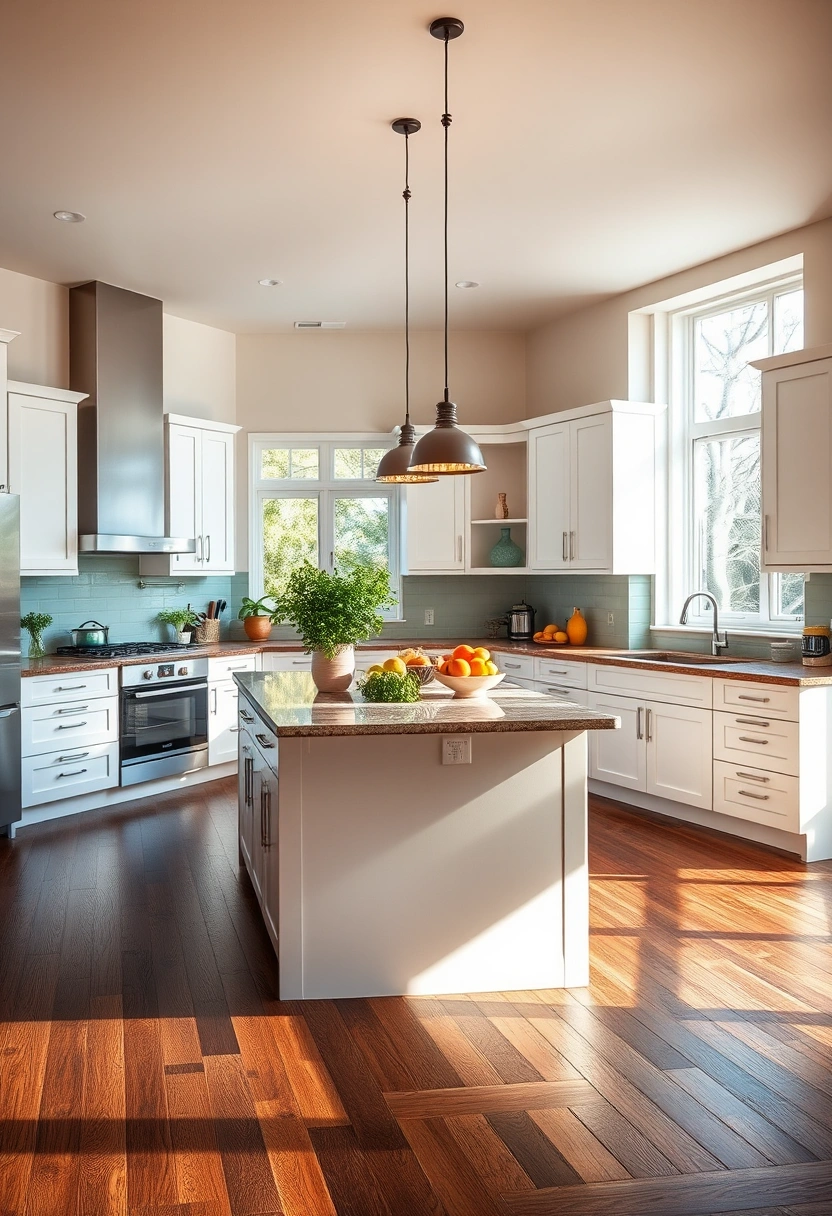 Imagine a peaceful Zen-inspired kitchen featuring bamboo flooring that brings tranquility to the space. The design includes minimalist cabinetry and a central island adorned with fresh herbs and a small water feature, creating a serene environment for mindful cooking and gathering.