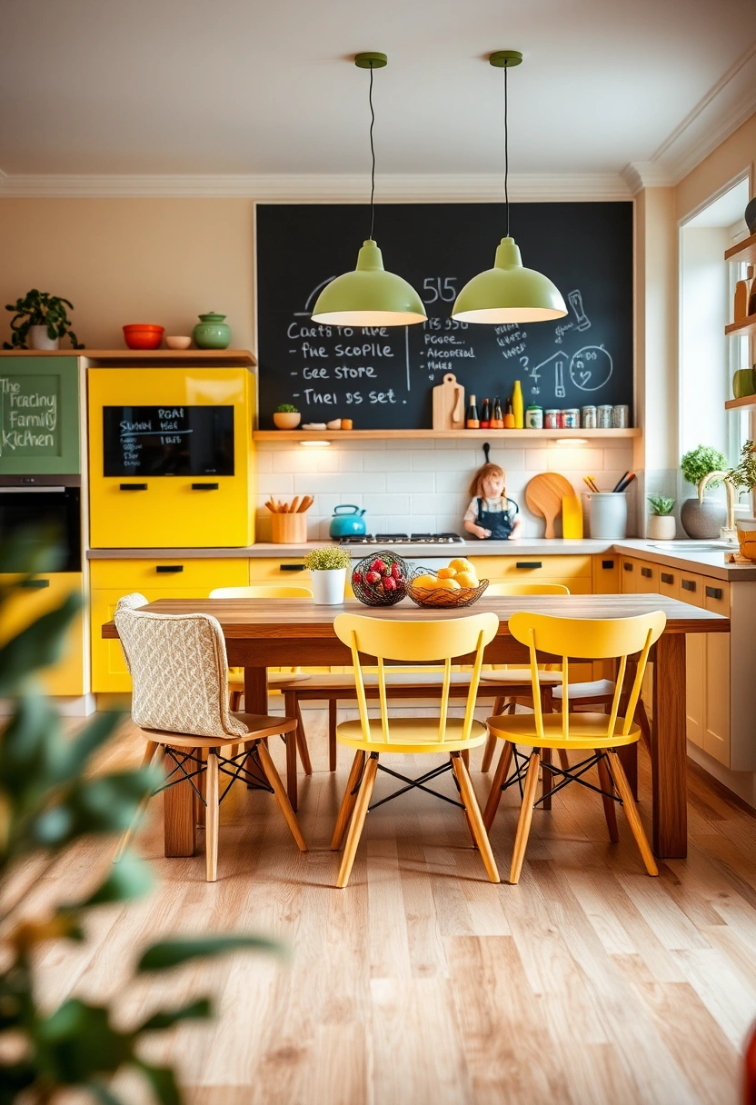 Colorful storage solutions add a playful touch, while a chalkboard wall invites kids to showcase their artwork and notes. Warm lighting from pendant fixtures enhances the cheerful color scheme of yellows and greens, creating a lively, family-friendly environment.