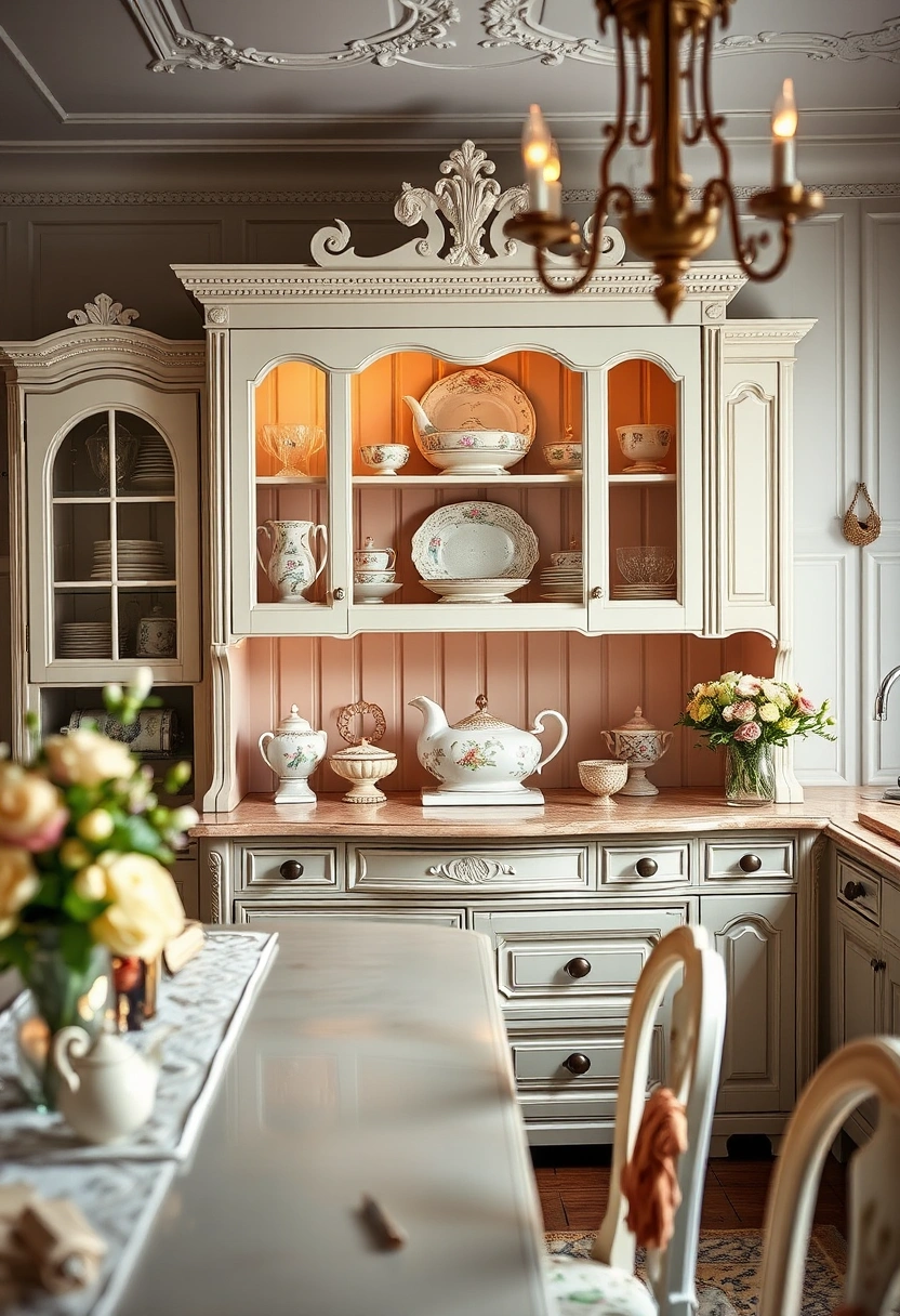 Step into a luxurious French country kitchen where ornate details and soft pastel colors create an enchanting atmosphere. The hutch showcases vintage porcelain and decorative glassware, adding elegance to the space.