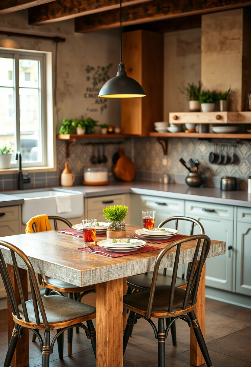 This chic kitchen artfully blends contemporary and vintage designs, featuring a polished concrete countertop paired with intricate tile work. A rustic dining table set for a meal, surrounded by mismatched chairs, creates an inviting gathering space.