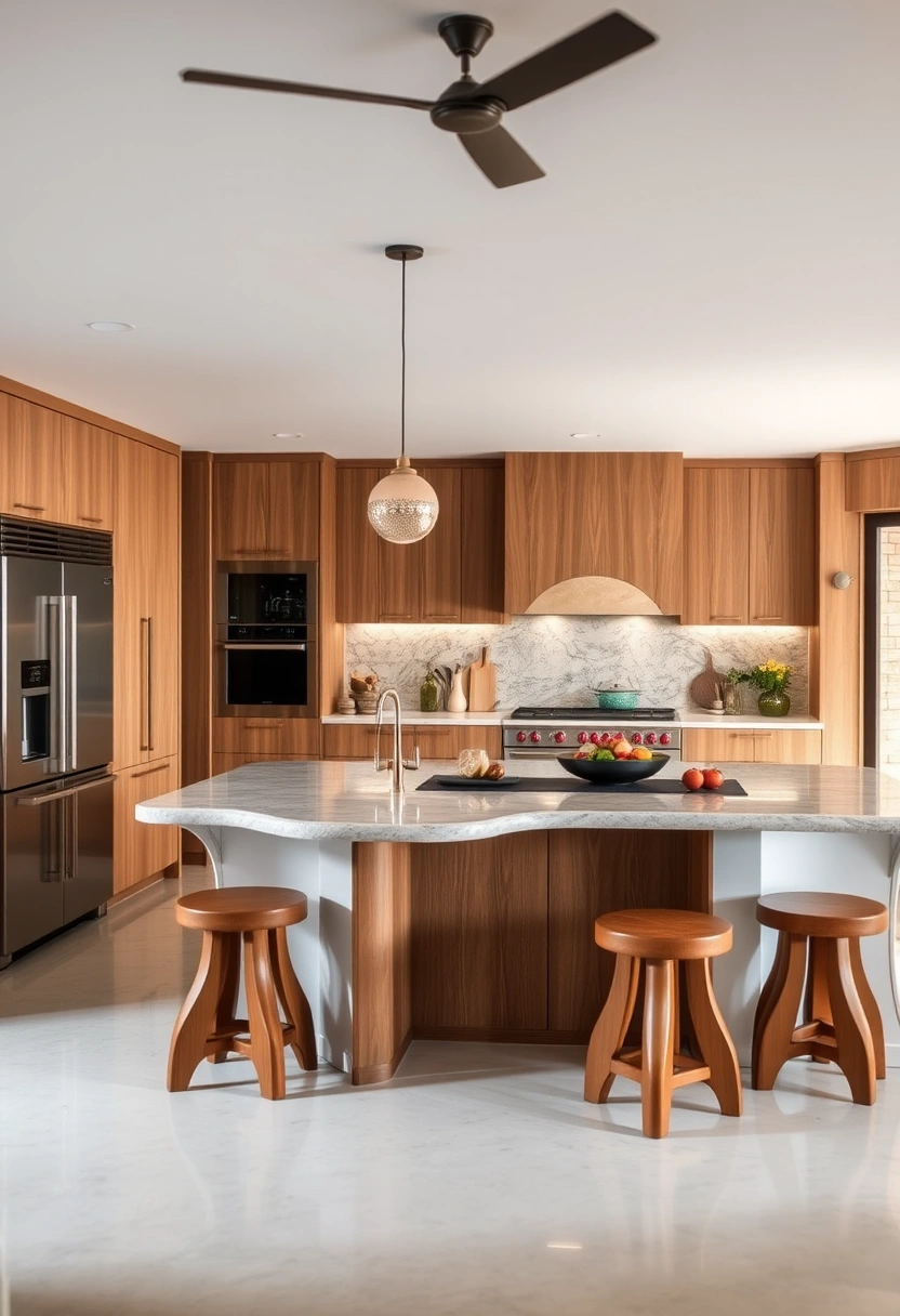 This sophisticated kitchen seamlessly combines modern technology with traditional craftsmanship, featuring sleek appliances and artisan woodwork that tells a story. A spacious island with a unique design serves as a focal point, surrounded by handcrafted stools that invite gatherings and conversations.