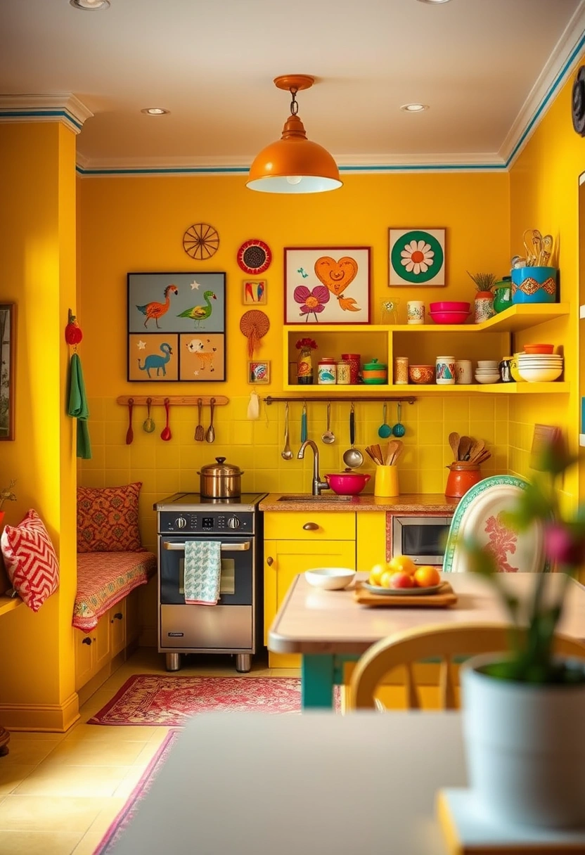 This playful kitchen features a bright yellow color scheme complemented by colorful textiles and accessories that bring joy to the space. A fun, whimsical wall art display adds personality, while a cozy seating area with patterned cushions invites relaxation and enjoyment.