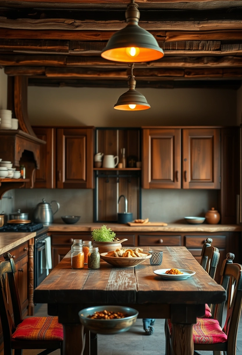 This rustic kitchen features traditional wooden cabinetry and a large farmhouse table that serves as the heart of the space. Colorful, handwoven textiles add warmth and character, while a collection of spice jars displayed prominently invites culinary exploration.
