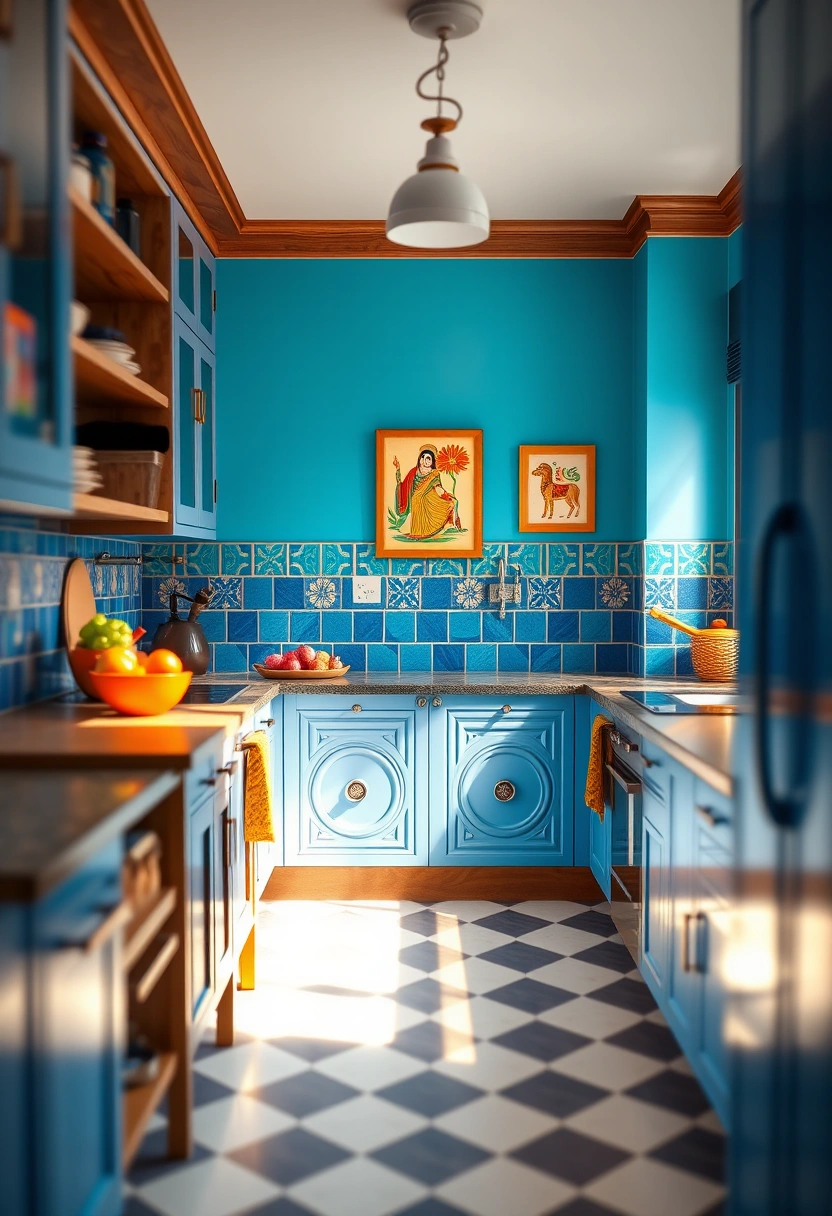 This vibrant kitchen is a feast for the eyes, designed with playful patterns and textures that create a cheerful ambiance. A bright blue color palette complemented by wooden accents enhances the lively atmosphere, while a unique tile backsplash featuring geometric designs adds visual interest.