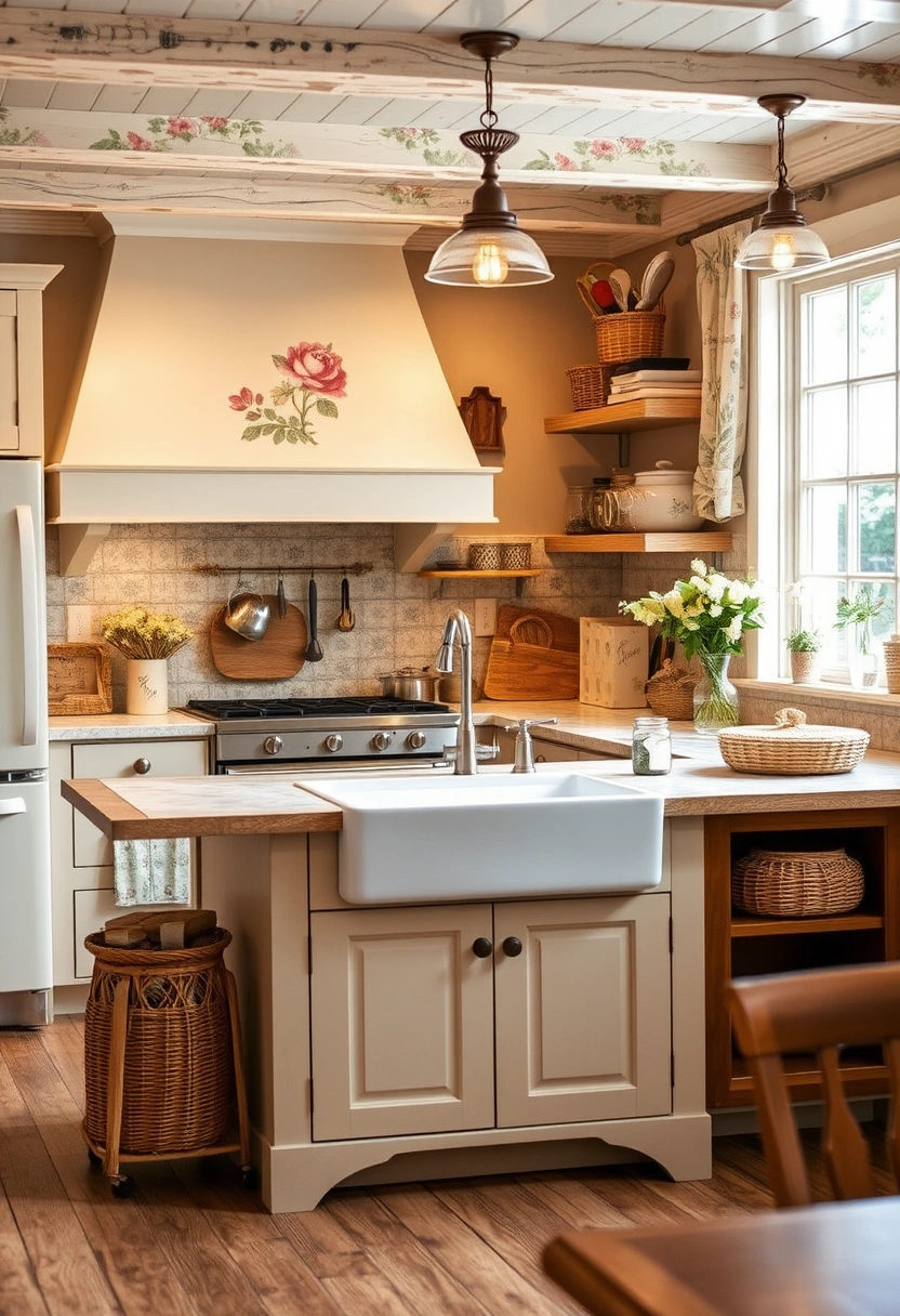 Step into a cozy cottage kitchen featuring a kitchen island with sink adorned with vintage floral patterns and warm wood elements. The farmhouse sink and inviting layout create a welcoming atmosphere, complemented by ambient lighting from antique fixtures.