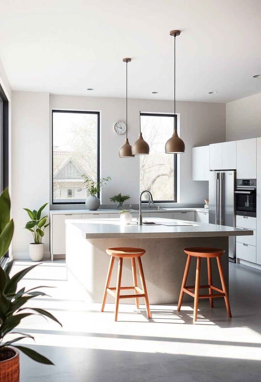 A minimalist kitchen embodies the principle of “less is more,” creating a serene environment that promotes tranquility. Featuring a sleek concrete island paired with simple wooden stools, this design embraces a neutral color palette that emphasizes calmness.
