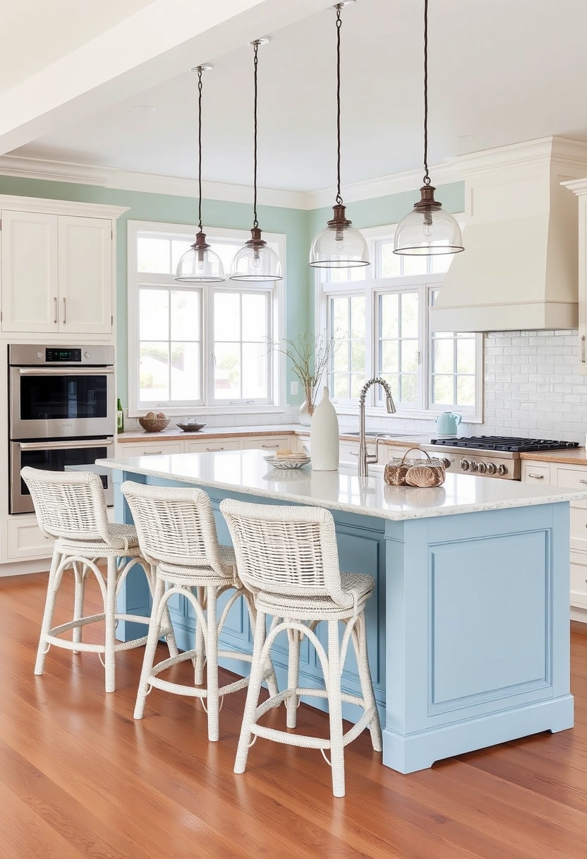 Transport yourself to the beach with a coastal-inspired kitchen that captures the essence of seaside living. A light blue island paired with white wicker stools creates a refreshing and airy atmosphere.
