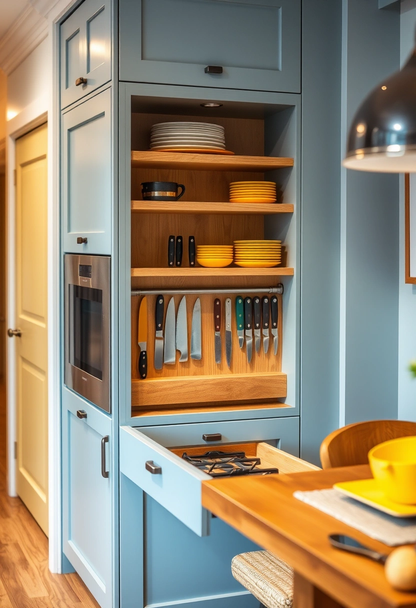 In a cozy urban kitchen, a built-in drawer system elegantly displays knives for easy access. This clever kitchen knife storage idea combines aesthetics with practicality, ensuring that your tools are both organized and within reach.