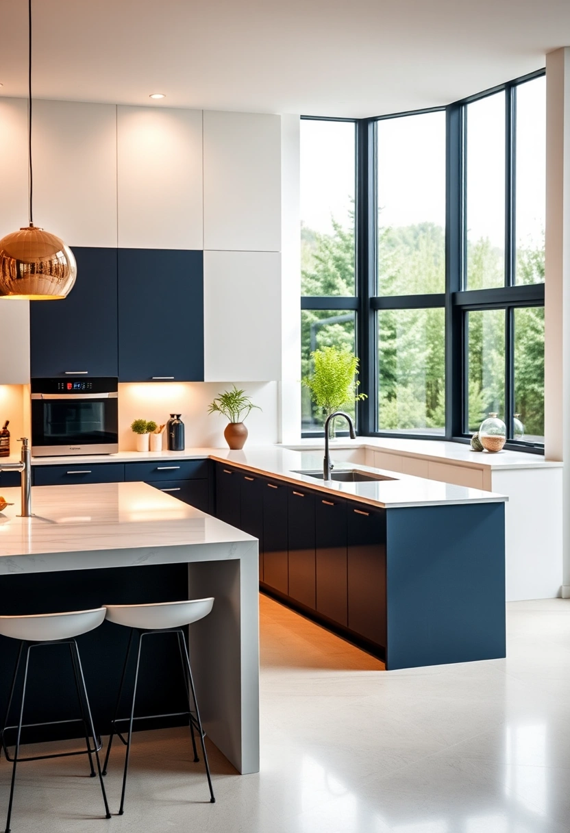 Imagine a spacious kitchen where sleek, minimalist cabinetry in soft white and deep navy sets a sophisticated tone. The centerpiece is a large island topped with stunning quartz, surrounded by stylish bar stools that invite casual gatherings.