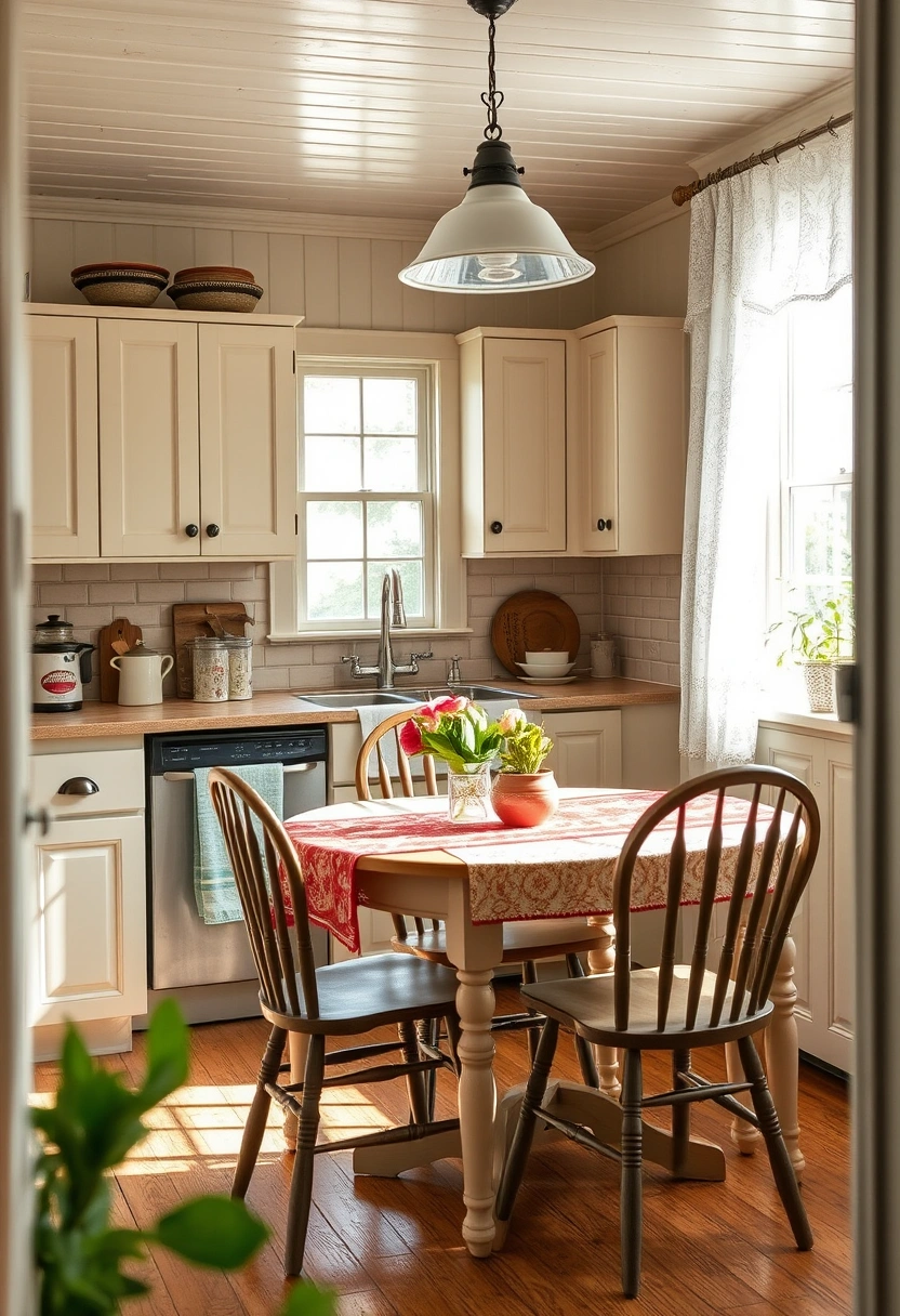 Embrace warmth and charm in this cozy cottage kitchen, featuring painted wood cabinetry and vintage-style hardware. The arrangement includes a small dining table with mismatched chairs and colorful textiles that invite relaxation and comfort.