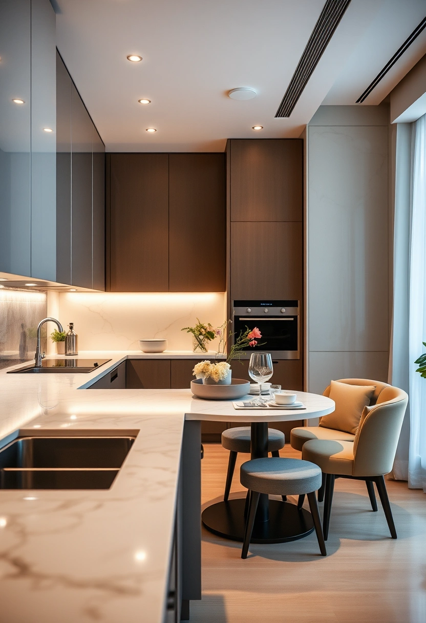 Experience the luxury of a sophisticated kitchen that showcases sleek marble countertops and elegant cabinetry. This design includes a small dining area with stylish seating, complemented by ambient lighting that creates a refined atmosphere.