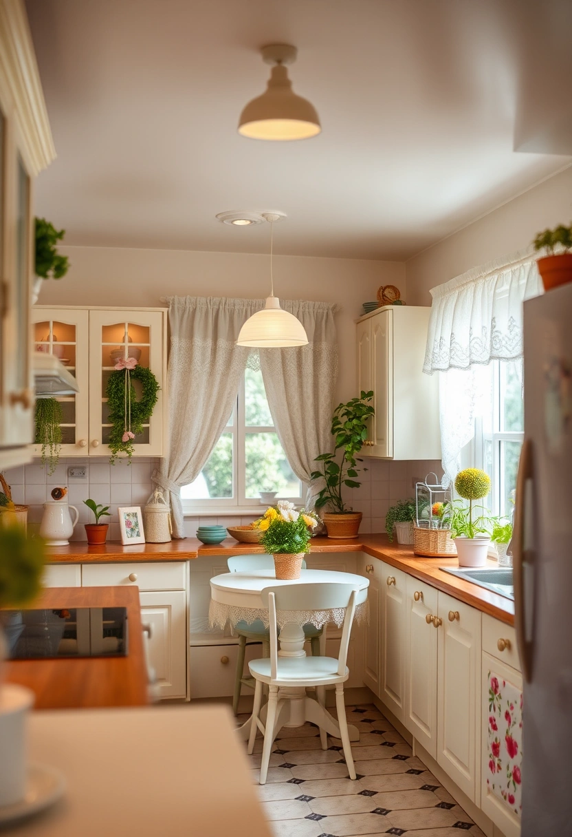 This cozy kitchen embraces a cottage style, featuring soft pastel cabinetry and floral accents that create a warm, inviting atmosphere. The layout includes a small breakfast nook with a vintage table, surrounded by lace curtains and potted plants.
