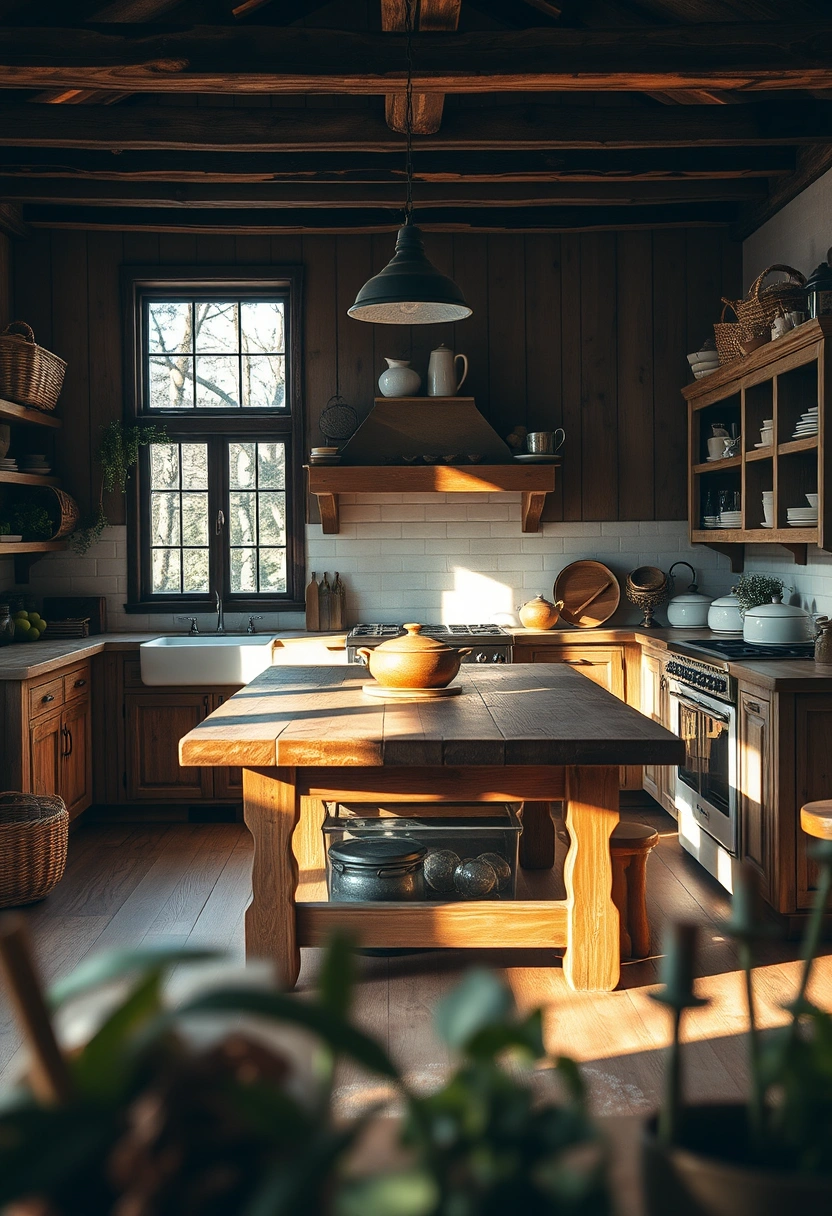 This cozy kitchen blends rustic charm with modern elements, featuring reclaimed wood beams that add character and warmth. A vintage farmhouse sink complements the rustic aesthetic, while warm, diffused lighting illuminates the space, creating an inviting atmosphere.