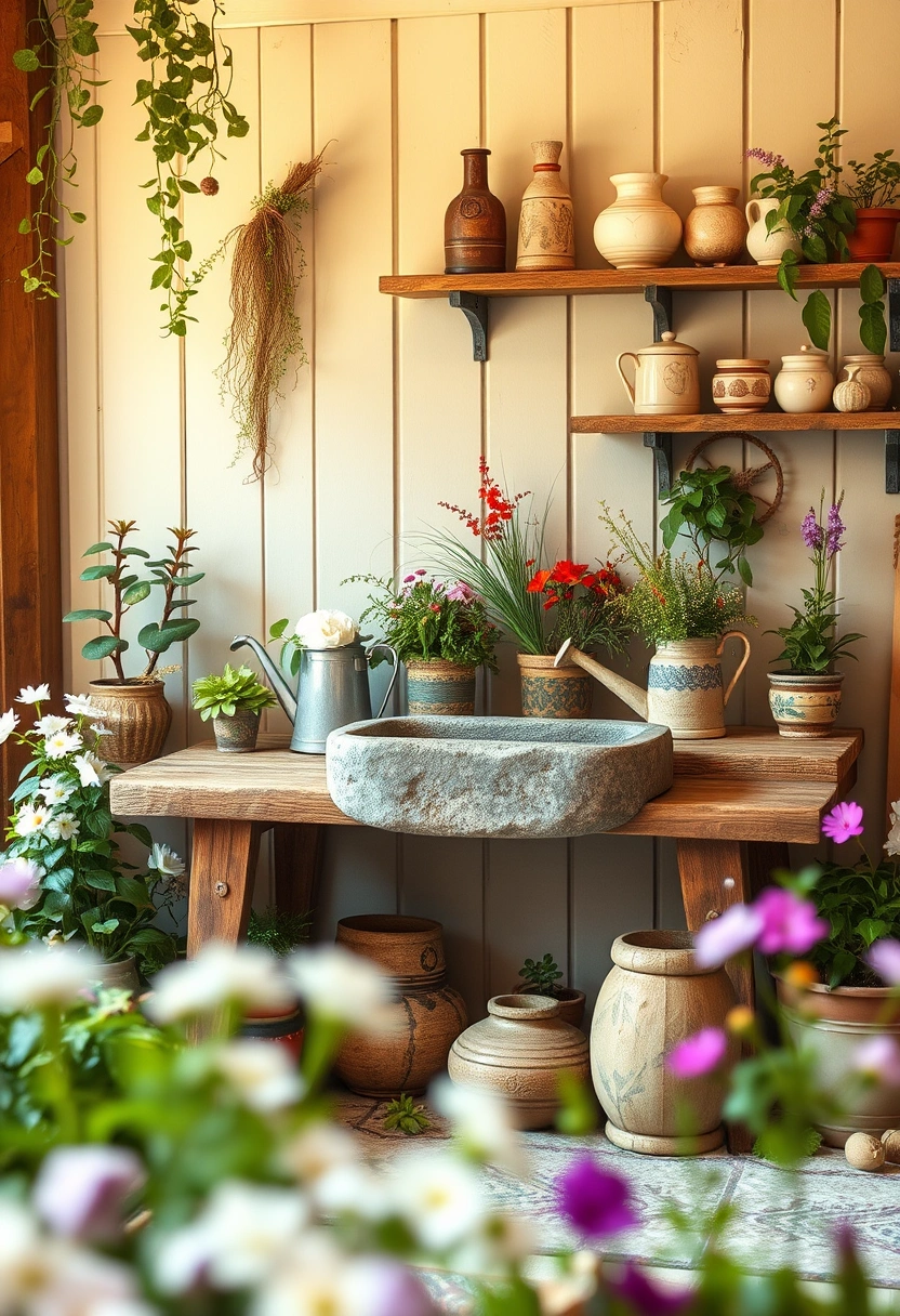 Imagine a serene mud kitchen retreat featuring a simple wooden bench with a stone sink, set amidst a lush garden. This composition includes an array of potted herbs and flowers, enhancing the natural beauty of the space.