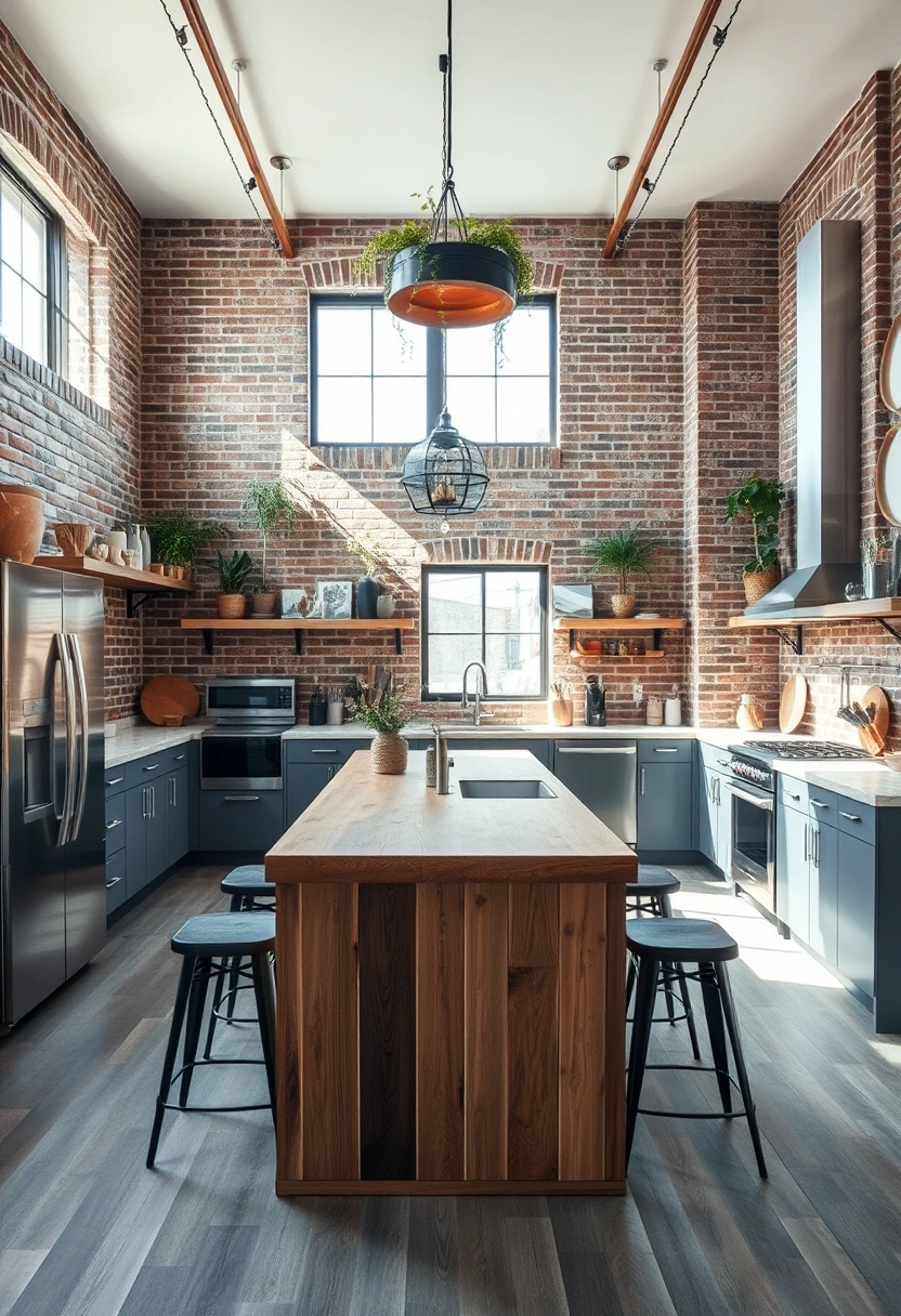 This modern natural kitchen features an industrial twist, characterized by exposed brick walls and stainless steel appliances that create an edgy yet inviting atmosphere. The layout centers around a large island with a reclaimed wood top, serving as a focal point for gatherings and culinary creativity.