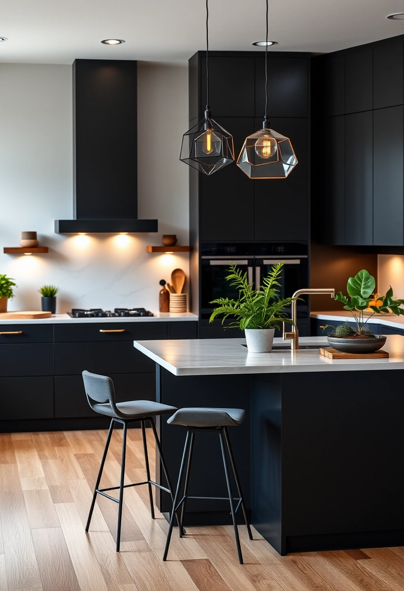 Pendant lights with Edison bulbs cast a warm glow throughout the kitchen, further enhancing the energetic and creative mood of the space. The dark color palette of blacks and grays adds depth and sophistication, making this kitchen ideal for those who love to entertain and experiment with flavors.