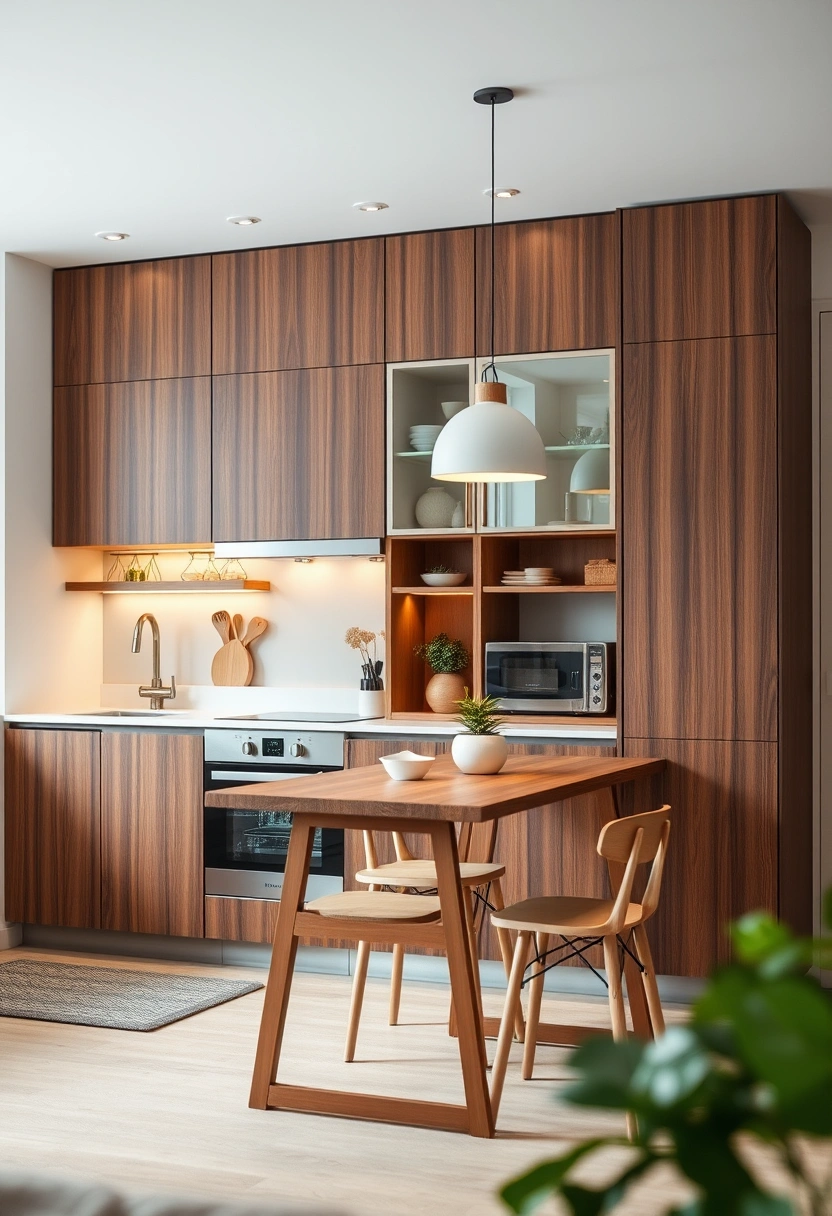 This multifunctional kitchen is designed with urban living in mind, emphasizing space optimization and practicality. The layout features a foldable table that maximizes space, allowing for flexible dining options.