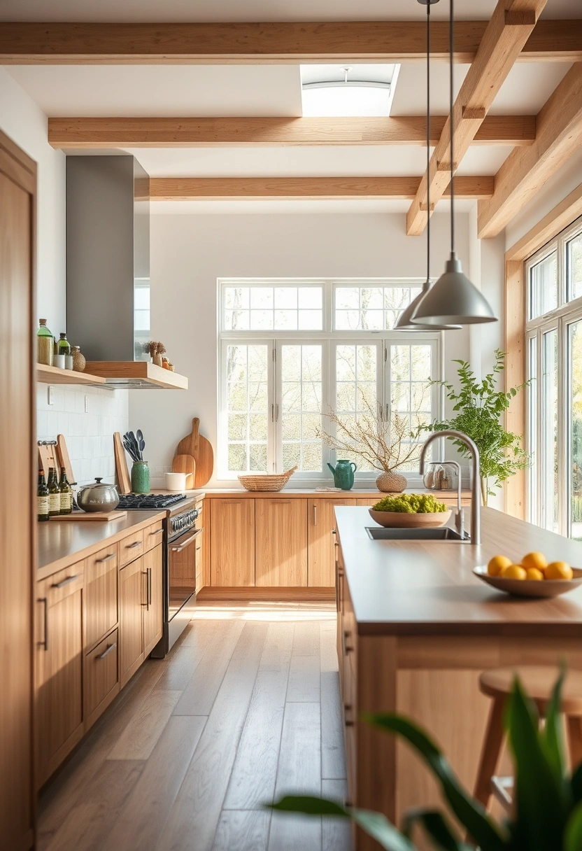 This fresh Scandi kitchen incorporates sustainable materials and eco-friendly design principles, featuring bamboo cabinetry and recycled glass accents. The layout includes a large island for meal prep, while natural light streams in through large windows, highlighting the earthy tones and textures that create a connection with nature.