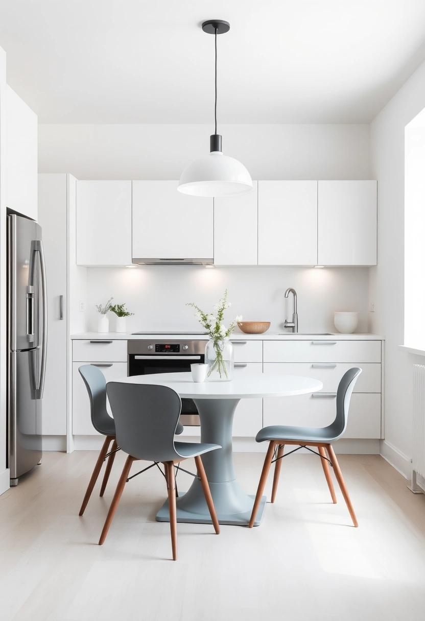 In this minimalist Scandi kitchen, clean lines and an uncluttered design take center stage. The sleek cabinetry in a soft white hue creates a serene backdrop, while a compact, round dining table paired with modern chairs adds functionality without overwhelming the space.