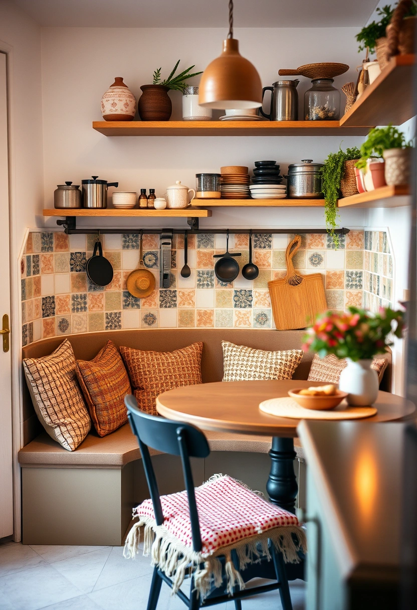 This cozy small boho kitchen idea features a charming breakfast nook with a round table and cozy cushions that invite leisurely meals and conversation. The colorful tile backsplash adds a playful touch, while an array of kitchen gadgets on open shelves enhances the eclectic feel of the space.