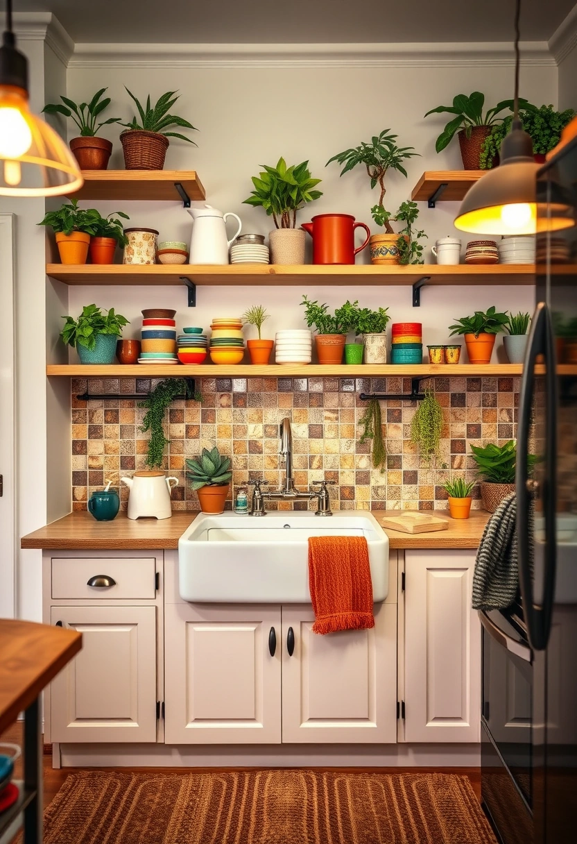 This eclectic small boho kitchen idea features open shelving that showcases an array of colorful kitchenware and vibrant plants, transforming the space into a cheerful cooking haven. The charming farmhouse sink, complete with a vintage faucet, serves as a stylish focal point, complemented by a mosaic tile backsplash in earthy tones.