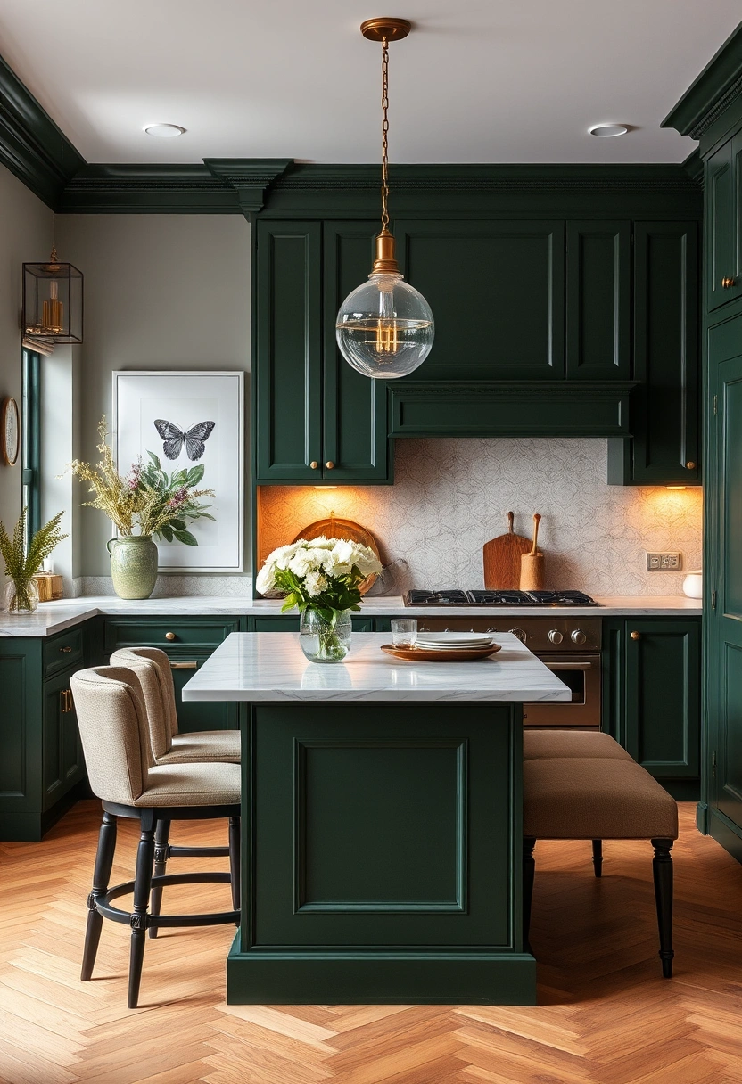 Experience the elegance of a small dark kitchen with deep green cabinetry and brass hardware. This layout includes a stylish island with a marble top, surrounded by comfortable seating that invites conversation.