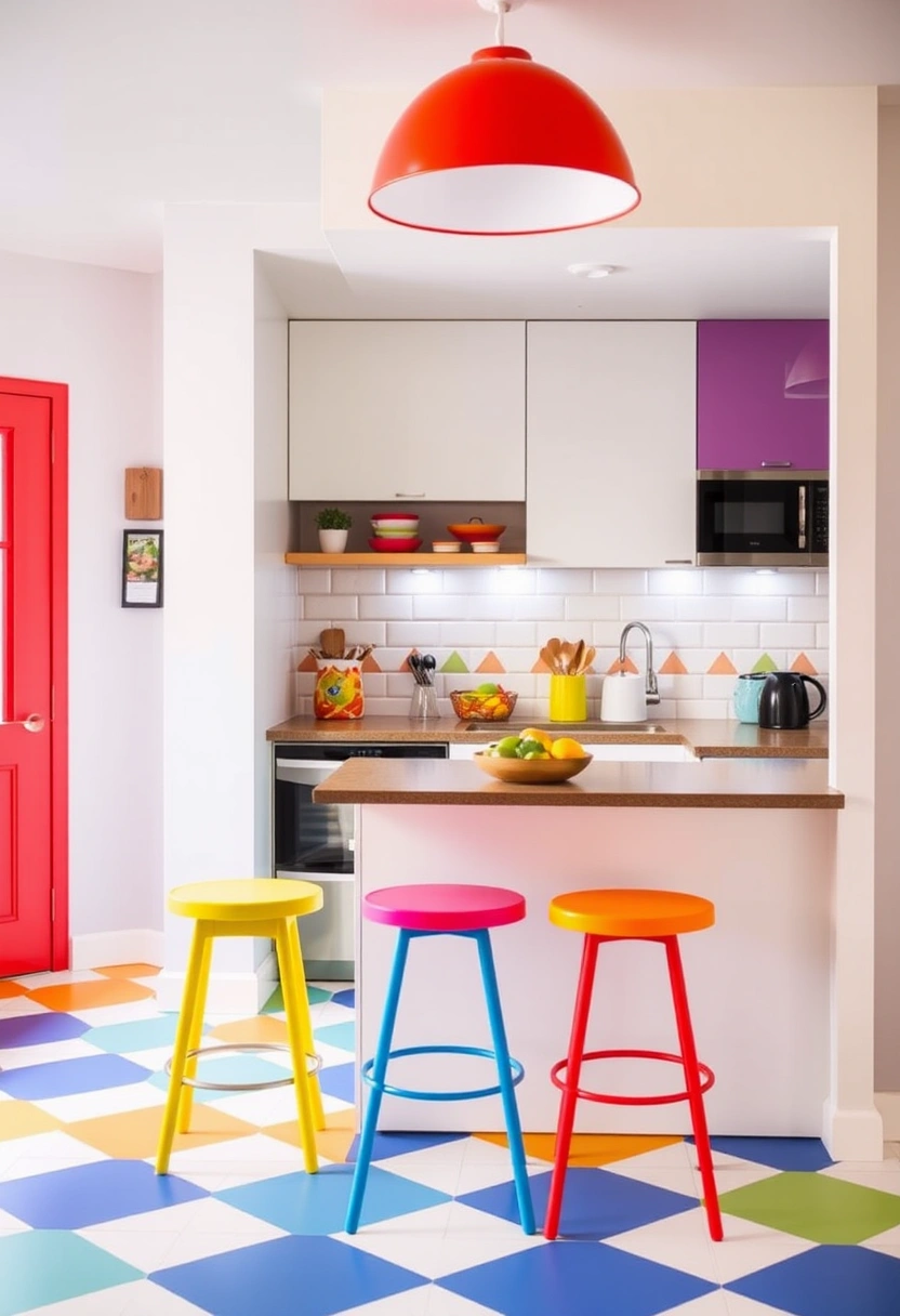 Visualize a playful kitchen filled with bold geometric patterns and vibrant colors. The layout features a compact island with colorful bar stools and a striking backsplash that draws attention.