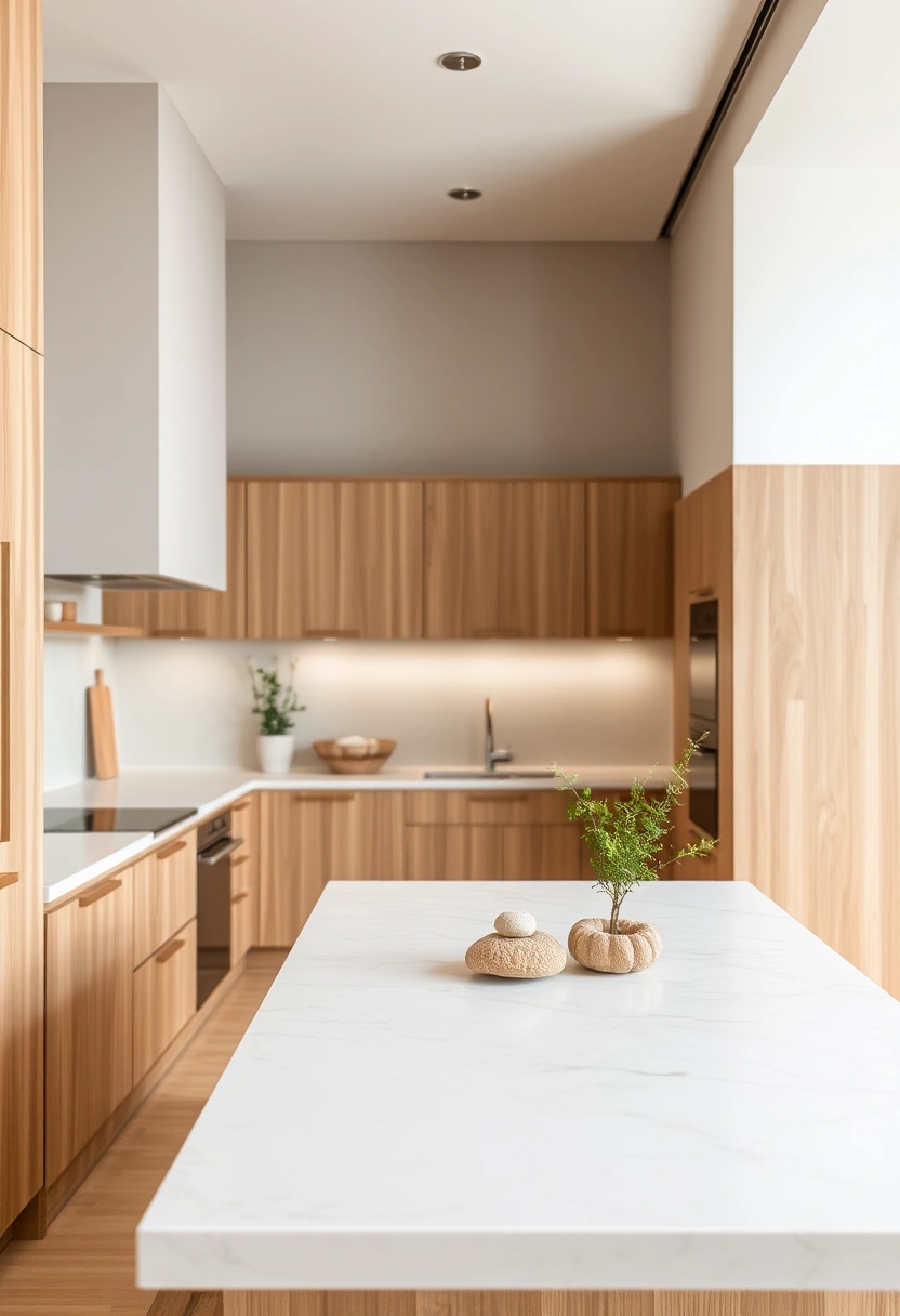 Decorative stones and small plants add a touch of nature, creating a peaceful cooking space that encourages mindfulness and creativity. This kitchen is designed for those who appreciate simplicity and serenity in their culinary environment.