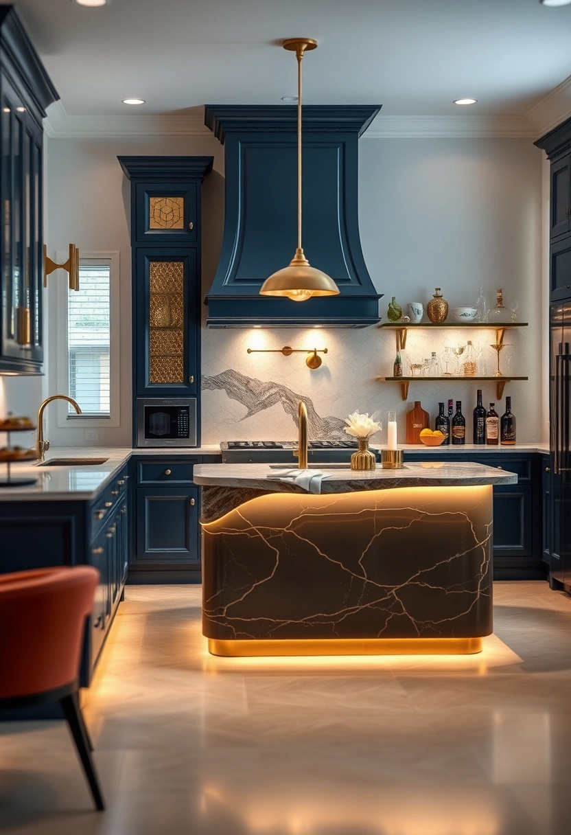 Imagine a luxurious small kitchen featuring high-end finishes and a beautifully crafted island with a waterfall countertop. Elegant lighting fixtures create a sophisticated atmosphere, while a color palette of deep blues and golds enhances the opulence of the space.
