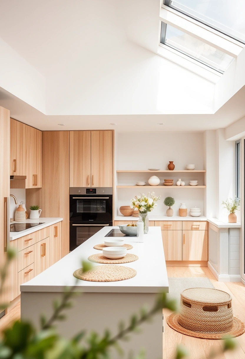 Enter a Scandinavian small kitchen where light wood cabinetry and a white island with clean lines create a bright and airy atmosphere. A large skylight allows diffused natural light to flood in, enhancing the serene mood of the space.