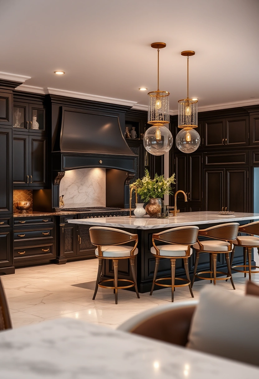 Showcasing rich, dark cabinetry with gold accents, this sophisticated unfitted kitchen design creates a luxurious atmosphere. A large island surrounded by elegant bar stools provides both functionality and style, while decorative pendant lights add an extra layer of sophistication.